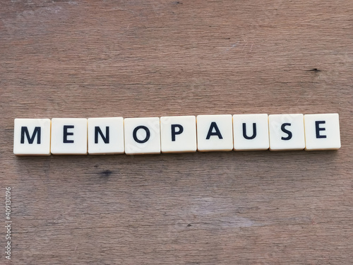 Top view MENOPAUSE crossword by square letter tiles against wooden background.Medical concept.