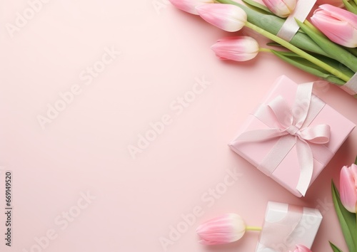 Top view Mother's Day decorations concept, photo of trendy gift boxes with ribbon bows and tulips on isolated pastel pink background with copy space for text