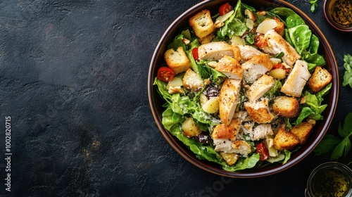 Top view of a bowl of Caesar salad with croutons, parmesan, and chicken. Copy space.