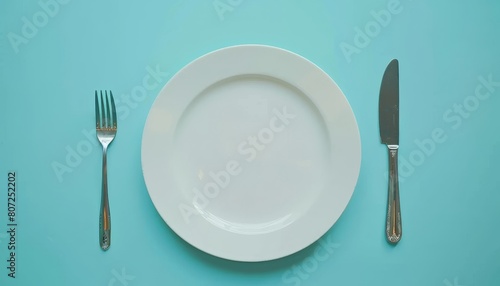 Top view of a chic table arrangement with an unoccupied white plate cutlery on a blue backdrop
