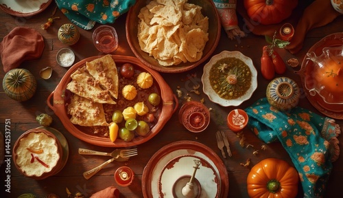 Top view of a colorful traditional Mexican meal with tortillas, salsa, and festive decorations set out to celebrate Mexican Independence Day