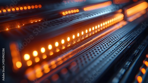 Top view of a compact server module cabinet with ambient lighting, glowing softly from beneath the surface, accentuating its high-tech design and structured cables