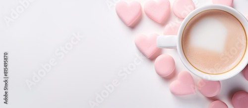 Top view of a cup of coffee with a heart shaped pink marshmallow on a white background providing copy space for text or images