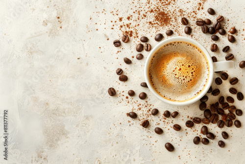 Top view of a full cup of coffee surrounded by roasted coffee beans on a textured white background