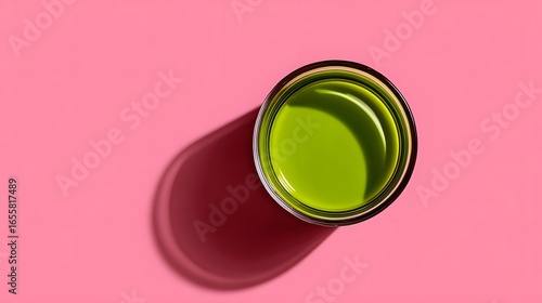 Top View of a Glass of Green Olive Oil on a Pink Background Highlighting Freshness and Quality