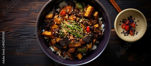Top view of a Korean Chinese or Asian vegan meal featuring a bowl of glazed fried aubergine stir fry with a sweet soy sauce glaze Includes copy space for image composition
