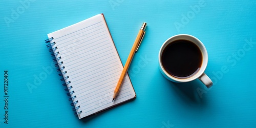 Top View of a Notebook, Pencil and a Cup of Coffee on a Blue Table, notebook, pencil, coffee, blue table