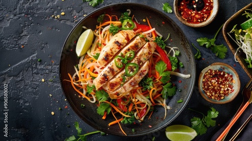 Top view of a papaya salad with fish sauce and lime, accompanied by perfectly grilled chicken fillets.