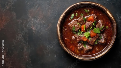 top view of a rich, aromatic beef stew in red wine sauce, styled with garnishes, in a rustic bowl with ample space for text, celebrating gourmet culinary art