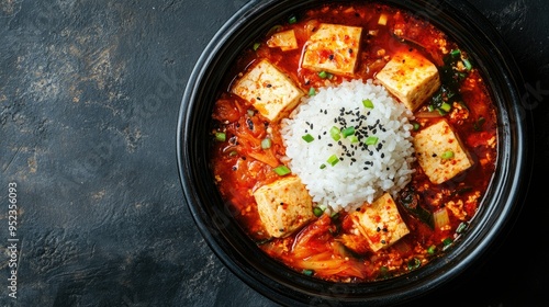 Top view of a steaming bowl of spicy kimchi jjigae with tofu and pork, served with rice. Copy space.