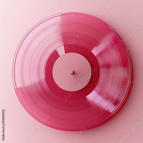top view of a transparent pink vinyl record on a light pink background showing glossy grooves with reflections