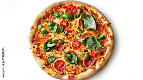 Top view of a Vegetable pizza floating in the air isolated on white background delicious and appetizing slice vibrant and colorful toppings mouth-watering and cheesy pizza dynamic and fun presentation