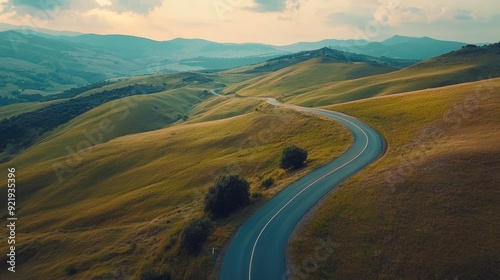 Top view of a winding road surrounded by rolling hills and distant mountain peaks. Ideal for nature and travel content