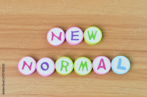 Top view of alphabet erasers with text NEW NORMAL over wooden background.