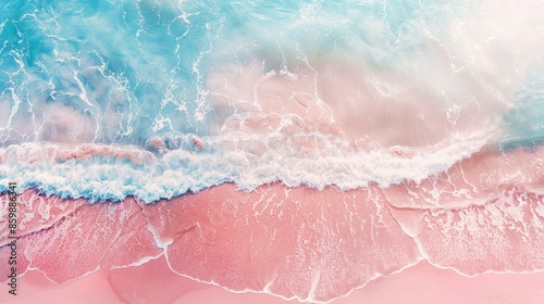 Top view of amazing pastel pink blue beach , copy space available, beautiful beach with pink water and pink sand, summer, water