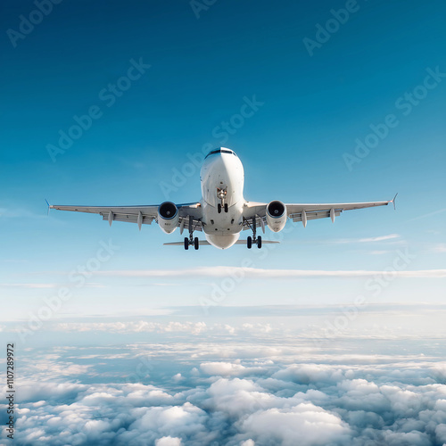 Top View of an Airplane Flying in Clear Blue Skies with Landing Gear Down and White Cloudscape Background