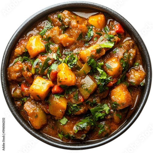 Top view of an extremely perfect looking Bhutta Curry in a dark enamel bowl isolated on a white transparent background