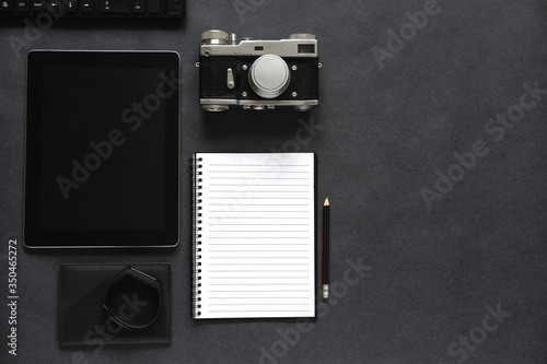 Top view of an open notebook with stationery items. Photographer's desk. Film camera and lenses.