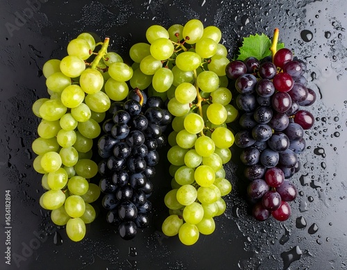 Top view of assorted grapes (green, red, black) scattered artfully on a reflective glass surface