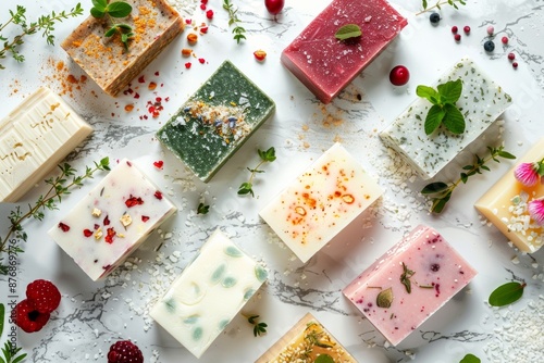 Top view of assorted variety of different handmade soap bars with natural ingredients, herbs, berries on white stone background. Skin care and organic soap making concept, spa cosmetic treatment .