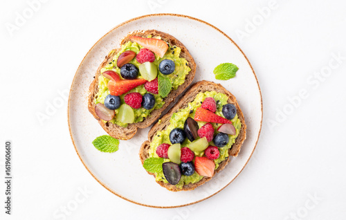 Top view of avocado toast with strawberry, blueberry, raspberry and grape. Healthy eating