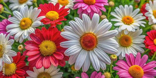 Top view of beautiful Marguerite Daisy, Argyranthemum, and LaRita Scarlet flowers in full bloom , garden, floral