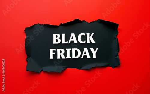 Top view of Black torn paper and the text black friday on a red background. Black Friday composition. High quality