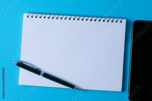 Top view of blank open notebook on blue background and different objects. Minimal flat lay style.