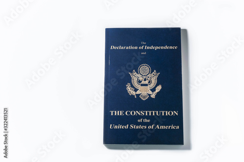 top view of blue booklet with declaration of independence and constitution of united states of america on white background