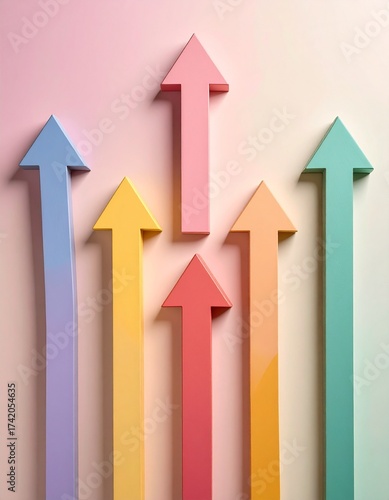 Top view of colorful arrows pointing upward, arranged side by side on a clean background,