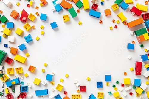 Top View of Colorful Bricks Scattered on White Background, Symbolizing Creativity and Building Skills in an Abstract Style