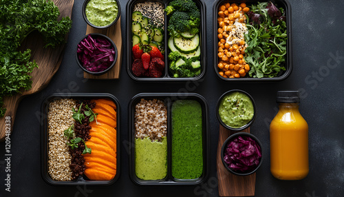 Top view of colorful, healthy food prepared lunch boxes filled with nutritious ingredients like vegetables, grains, proteins and bottles of fresh juice, perfect for a balanced and clean visual meal.