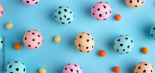 Top view of colorful pastel Easter eggs with black dots on blue background, flat lay decoration for Easter holiday cards, banners, and festive seasonal designs.