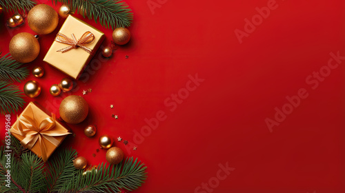Top view of composition with Christmas decorations and copy space on red background. New Year winter banner.
