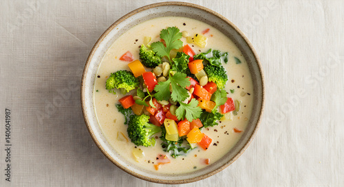 Top View Of Creamy Vegetable Soup With Coconut Milk And Fresh Herbs