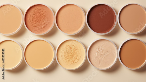 Top view of different textures and colors of cosmetic creams or face foundation in round jars on a flat surface. Smears of cosmetic products.