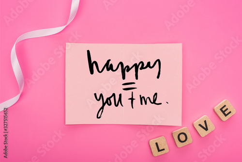 top view of empty paper card with happy you and me lettering near ribbon and love lettering on wooden cubes isolated on pink