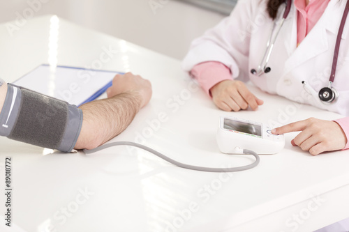 Top view of female doctor checking man blood pressure at the cli