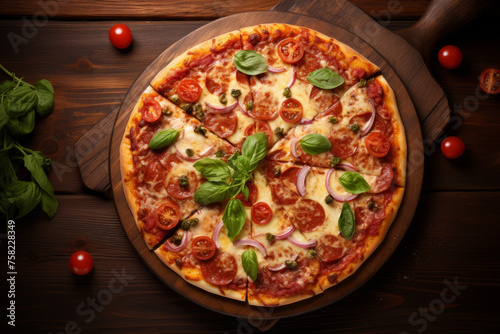 Top view of fresh pizza with tomatoes on dark wooden table