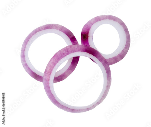 Top view of fresh red or purple Spanish onion rings or slices in stack isolated on white background with clipping path