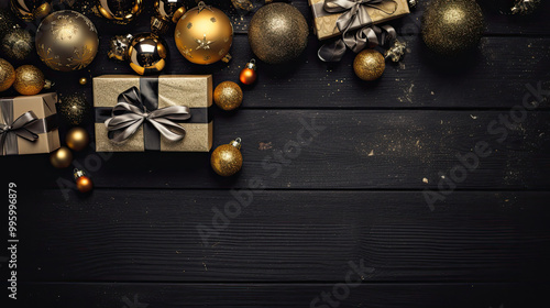 Top view of gifts, bows and Christmas decorations on a light black wooden background