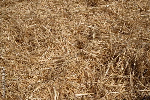 Top view of haystacks in rice field. Rice straw that has dried on the ground. Rice mill solid waste