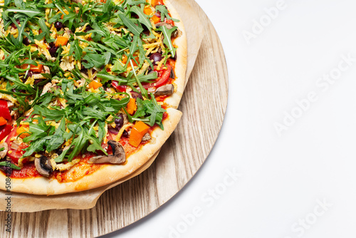Top view of homemade vegan pizza on wooden plate, on white with copy space.
