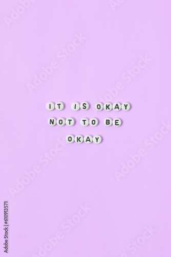 Top view of "it is okay not to be okay" quotes made out of beads on pastel background. motivation and success concept