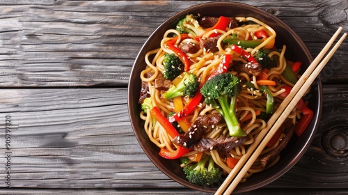 Top view of lo mein noodles with beef, broccoli, and bell peppers, garnished with sesame seeds.