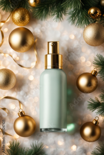 top view of luxury unbranded bottle with cosmetic product on festive Christmas background. Festive presentation of skin care product