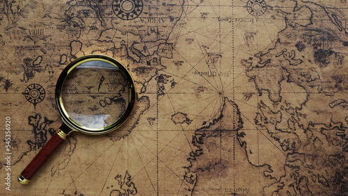 Top view of Magnifying glass placed on a vintage world map Travel ideas and places to visit
