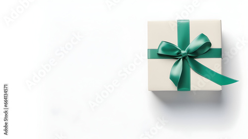 Top view of minimalist elegant white square cardboard gift box with green satin bow ribbon on white flat lay background with copyspace. Surprise present for special occasion, christmas, celebration.