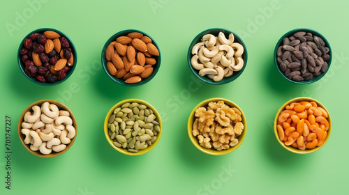 Top view of mixed nuts and dried fruits on a light green background. Bowls with peanuts, cashews, hazelnuts, almonds, pumpkin seeds, raisins, dried apricots. Healthy nutrition concept