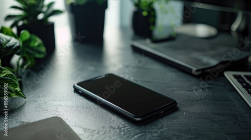 Top view of modern workspace with laptop, smartphone and plant on dark table